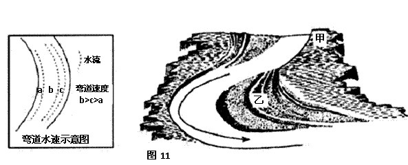 20.图11中有关河曲地貌、弯道速度、外力作用和沿岸人类活动的组合正确的是