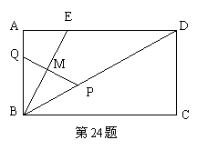 24. (本题满分14分)已知矩形ABCD中,AB=4,对角线BD=2AB,且BE平分∠ABD,点P从点D以每秒2个单位沿DB方向向点B运动,点Q从点B以每秒1个单位沿BA方向向点A运动,设运动时间为t秒,△BPQ的面积为S.