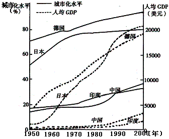 119.(2004天津卷)图中反映的城市化与人均GDP的关系是 ( ) A.不同发展阶段,城市化水平与人均GDP水平相互影响的程度不同 B.某阶段人均GDP水平与城市化水平呈负相关 C.城市化发展是提高人均GDP水平的主要动力 D.人均GDP水平越高,城市化发展速度越快 答案:A 解析:综合分析四国两个要素,人均GDP越多,城市化水平越高,两者呈正相关。但影响程度不同,如日本80年代人均GDP增长很快,但城市化水平的提高却很慢,而70年代前则不是这样。 120.(2004天津卷)20世纪50年代至80年代,图中四个国家在城市化水平和人均GDP平均增长速度方面最快的是 ( ) A.印度 B.中国 C.日本 D.德国 答案:C 解析:根据曲线的斜率,日本增长的速度是最快的。 121.(2004天津卷)与其他三个国家相比,中国的城市化 ( ) A.发展水平较高 B.应加快发展 C.发展速度最快 D.应限制发展 答案:B 解析:我国的人均GDP90年代后增长较快,而我国的城市化水平却很低,应加快发展。 读图3回答122-124题。