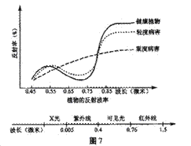148.(2004广东地理试卷)图7中,重度病害植物反射率高于健康植物反射率的波段是 ( ) A.红外线 B.X光 C.可见光 D.紫外线 答案:AC 解析:在植物的反射率图中先找出重度病害植物反射率高于健康植物反射率的波段(0.55-0.80微米),然后对应下面的图即可找出正确的答案。 149.(2004广东地理试卷)根据图7的原理,可用遥感技术直接 ( ) A.划分植物类型 B.判读植物生长的土壤类型 C.监测树木的生长状况 D.估计粮食作物的产量 答案:CD 解析:用知识的迁移方法来解决实际问题。 150.(2004广东地理试卷)不同的地物和地物的不同状况也有不同的反射率,根据这个原理,可以利用遥感的工作有 ( ) A.判断水体污染 B.判断人口分布 C.分析城市大气污染 D.估算工业生产总值 答案:AC 解析:水体、城市大气属于不同的地物。水体污染、城市大气污染属于地物的不同状况。