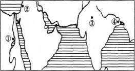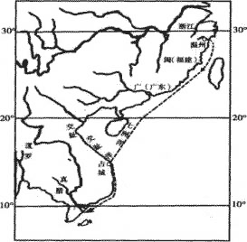 图2 图3 105.(2004北京卷)大理石( ) A.因变质作用而形成 B.按成因属于岩浆岩 C.因外力作用而形成 D.形成于地壳硅镁层 答案:A 解析:本题考查的内容是:岩石的形成。大理岩属于变质岩,是由石灰岩受热变质而来,故答案B错误;变质作用属于内力作用,敌答案C错误;硅镁层主要由玄武岩类组成,故答案D错误。 106.(2004北京卷)该建筑位于图3中的 ( ) A.① B.② C.③ D.④ 答案:C 解析:本题考查的内容是:代表性建筑所在国家及在地图上的定位。本图为印度的代表建筑--泰姬陵(初中课本原图),故选答案C。 107.(2004北京卷)图3中①、②、③、④四地自然条件相比 ( ) A.①、②两地均为荒漠 B.②地年降水量最少 C.③地有明显的旱季和雨季 D.④地比①地气温年较差大 答案:C 解析:本题考查的内容是:世界气候类型的分布及气候特征。。①为热带沙漠气候,②为地中海气候,故答案A错误;①地年降水量最少,故B错误;③为热带季风,有明显的旱季和雨季,故C正确;④为热带季风,又因其距海洋近,深受海洋的影响,和①相比其气温年较差要小,故D错误。 108.(2004北京卷)12月份,自东向西穿过直布罗陀海峡的航船常遇到 ( ) A.顺风顺水 B.逆风顺水 C.顺风逆水 D.逆风逆水 答案:D 解析:本题考查的内容是:风向和洋流。我们知道12月份北半球为冬季,地中海地区应该受到盛行西风的控制,故船舶自东向西穿过直布罗陀海峡时,为逆风;我们还知道在地中海和太平洋之间存在着明显的密度流,表层是由太平洋流向地中海,故逆水。 109.(2004北京卷)下列铁路线两端的城市1月平均气温差别最小的是 ( ) A.京哈线 B.焦柳线 C.浙赣线 D.青藏线 答案:C 解析:本题考查的内容是:我国一月份两城市平均气温的差别。由一月份世界等温线的分布图(高中课本原图),我们可以看出:温带等温线密集,热带地区稀疏,故温带地区温差较大。首先,我们要判断出下列铁路线两端的城市:京哈线(北京、哈尔滨);焦柳线(焦作、柳州);浙赣线(杭州、株洲);青藏线(西宁、拉萨)。然后,根据其所处的纬度位置及跨越的纬度,我们可以判断出一月平均气温差别最小的是C。 《真腊风土记》(元)记载:①自温州开船,西南行,历闽、广海外诸州港口,过七洲洋,经交趾洋到占城。又自占城顺风可半月到真腊;②真腊四时常如五六月天,不识霜雪,半年有雨,半年绝无;③信教者削发穿黄,偏袒右肩,其下系黄布裙,跣足。据此并结合图1,回答110-111题。