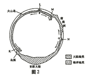 142.(2004广东地理试卷)年温差最大的一组气候类型是 ( ) A.①②⑥ B.②④⑤ C.④⑥⑦ D.②③⑤ 答案:C 解析:这是气候统计图的另一类表示形式。只要学生抓住分析气候特征的基本规律,即可分析出最高温、最低温的基本规律。 143.(2004广东地理试卷)图中①表示的气候类型为 ( ) A.热带雨林气候 B.热带沙漠气候 C.温带大陆性气候 D.地中海气候 答案:A 解析:①终年气温在15℃以上,降水量介于1500mm至3000mm之间,故为热带雨林气候。其他依次为热带草原气候、热带沙漠气候、温带季风气候、亚热带季风气候、亚寒带针叶林气候和极地气候。 144.(2004广东地理试卷)图中⑦对应的自然带可能是 ( ) A.温带落叶阔叶林带 B.温带草原带 C.苔原带 D.亚寒带针叶林带 答案:C 解析:①终年气温在15℃以上,降水量介于1500mm至3000mm之间,故为热带雨林气候。其他依次为热带草原气候、热带沙漠气候、温带季风气候、亚热带季风气候、亚寒带针叶林气候和极地气候。其他问题就迎刃而解了。⑦对应的气候为极地气候,对应的自然带可能是苔原带。 145.(2004广东地理试卷)反映大陆东岸纬度地带性的一组气候类型是 ( ) A.①②③④ B.③④⑤⑥ C.②⑤⑥⑦ D.①⑤④⑥ 答案:D 解析:先判段出①-⑦的气候类型分别是热带雨林气候、热带草原气候、热带沙漠气候、温带季风气候、亚热带季风气候、亚寒带针叶林气候和极地气候。此问题就迎刃而解了。 图2是反映岩石圈板块分布情况的地球剖面示意。读图2回答146-147题。