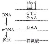 下图表示人体控制合成血红蛋白的 DNA 分子的碱基序列转录和翻译过程,a-d 表示四种基因突变:a 丢失 C/G;b 增加 C/G;c 由 T/A 变为 C/G ;d 由 T/A 变为 C/G 。假设四种突变均独立发生,则突变后血红蛋白不发生变化的是 (可能用到的密码子: 谷氨酸 GAG;甘氨酸 GGA;天冬氨酸 AAU/AAC;赖氨酸 AAA/AAG)