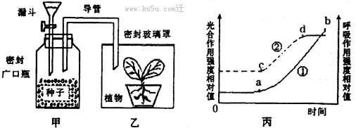 Ⅱ.下图甲、乙是在外界条件恒定的情况下,种子呼吸作用及植物光合作用实验装置示意图。丙图中曲线①表示种子呼吸作用相对强度的变化,曲线②表示植物光合作用相对强度的变化。由漏斗向盛放种子的广口瓶内加入少量水后(图中a点),丙图的曲线发生了变化。请据图回答: