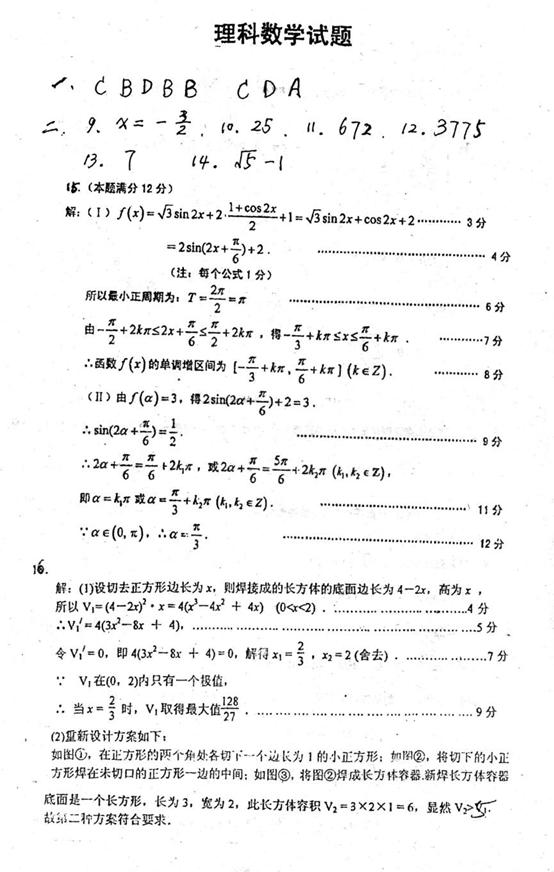 在一次数学实践活动课上,老师给一个活动小组安排了这样的一个任务:设计一个方案,将一块边长为4米的正方形铁片,通过裁剪、拼接的方式,将它焊接成容积至少有5立方米的成方体无盖容器(只有一个下底面和侧面的长方体),该活动小组接到任务后,立刻设计了一个方案,如下图所示,按图1在正方形铁片的四角裁去四个相同的小正方形后,将剩下的部分焊接成长方体(如图2),请你分析一下他们的设计方案切去边长为多大的小正方形后能得到的最大容积,最大容积是多少?是否符合要求?若不符合,请你帮他们再设计一个能符合要求答方案,简单说明操作过程和理由。