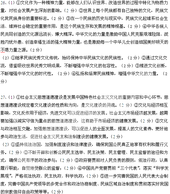 28、(1)加强和谐文化建设,必须以马克思主义、毛泽东思想、邓小平理论和“三个代表”重要思想为指导,全面贯彻落实科学发展观,发扬与时俱进的精神,积极推动文化创新。(2分)(2)加强和谐文化建设,要继承和发扬中国传统文化中的和谐思想观念,承接和弘扬中国传统和谐思想中和合理成分,充分发掘其蕴涵的时代价值。(2分)(3)加强和谐文化建设,要注意吸收借鉴世界优秀文明成果,博采众长,使其熔铸于和谐文化建设之中,这是建设和谐文化的一个重要途径。(2分)(4)加强和谐文化建设,还要立足于社会生活实际,在内容和形式上进行文化创新,努力创造中华文化的新辉煌。(2分)