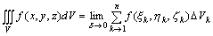 设函数u=f(x,y,z)在空间有界闭区域(V)任意划分成n个子域(△V1),(△V2),(△V3),…,(△Vn),它们的体积分别记作△Vk(k=1,2,…,n).在每一个子域上任取一点 |