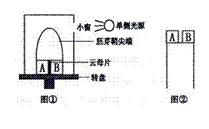某校生物兴趣小组把一个胚芽鞘尖端放在一块琼脂块上,琼脂块的中央被云母片隔开,同时被一个纸盒罩住,纸盒的一侧开口,有单侧光照(如图①所示)。经过以下三种方法处理一段时间:仅纸盒转转、仅胚芽鞘的琼脂块转动、整个装置同时转动,然后分别把A、B所示琼脂块放在三个切尖端胚芽鞘的切口上(如图②)。胚芽鞘的生长状况分别 ( )