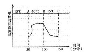 右图表示某人在休息时,单位时间内流经其单位面积皮肤血管内血液的相对流量,在时刻A,室内温度由15℃突升至40℃,在时刻B,室内温度又突降至15℃,下列说法正确的是 ( )
