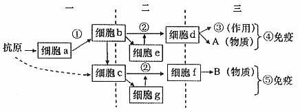 D. 对切除胸腺的小鼠进行大剂量的X射线照射,导致小鼠丧失全部特异性免疫功能,通过输入细胞f可使⑤完全恢复