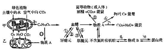 26.(16分)下图为高等绿色植物和高等动物(如人体)新陈代谢的部分过程示意图,请分析回答: