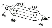 玻璃管已经抽成真空,当左右两个电极按图示的极性连接到高压电源时,阴极会发射电子。电子在电场的加速下飞向阳极。挡板上有一个扁平的狭缝,电子飞过挡板后形成一个扁平的电子束。长条形的荧光板在阳极端稍稍倾斜向轴线,电子束掠射到荧光板上,显示出电子束的径迹。