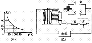 12.如图(甲)所示为热敏电阻的R-t图象,图(乙)为用此热敏电阻R和继电器组成的一个简单恒温箱温控电路,继电器线圈的电阻为10Ω,当线圈中的电流大于或等于20mA时,继电器的衔铁被吸合。为继电器线圈供电的电池电动势E=9.0 V,内阻可以不计.图中的“电源”是恒温箱加热器的电源,则( )