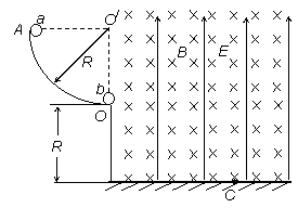 (10分)如图所示,位于竖直平面内的1/4光滑圆弧轨道,半径为R,O点为切点,离水平地面高R,OO/右侧为匀强电场和匀强磁场叠加,大小分别为E、B,方向如图所示。质量为m、带电+q的小球a从A静止释放,并与在B点质量也为m不带电小球b正碰,碰撞时间极短,且a球电量不变,碰后a沿水平方向做直线运动,b落到水平地面C点,已知重力加速度为g。求:C点与O点的水平距离s。