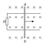 (10分)两根平行光滑金属导轨MN和PQ水平放置,其间距为d=0.6m,磁感应强度为B=0.5T的匀强磁场垂直轨道平面向下,两导轨之间连接的电阻R =5.4Ω,在导轨上有一粗细均匀的铜棒ab,铜棒与导轨垂直。铜棒的电阻为1.0Ω,其长度为l=1.0m,如图所示。在铜棒上施加水平拉力F使其以v=10m/s的速度向右匀速运动。设金属导轨足够长,金属导轨的电阻不计,铜棒与金属导轨接触良好。磁场范围足够大。求: