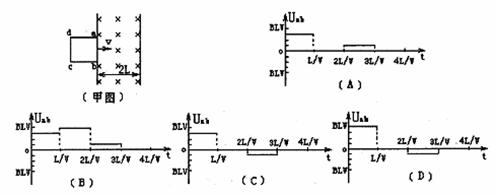 19.如图(甲)所示,一个正方形单匝线圈abcd,边长为L,线圈每边的电阻均为R,以恒定速度v通过一个宽度为2L的匀强磁场区,磁感应强度为B,方向垂直直线面向里。ABCD图中能正确反映ab两端电压Uab随时间t变化关系的是 ( )