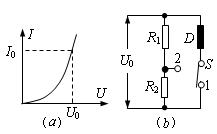 一个用半导体材料制成的电阻器D,其电流I随它两端电压U变化的关系图像如图(a)所示,将它与两个标准电阻R1、R2组成如图(b)所示电路,电压U0恒定,当电键S接通位置1时,三个用电器消耗的电功率均为P. 将电键S切换到位置2后,电阻器D和电阻R1、R2消耗的电功率分别是PD、P1、P2,下列关系中正确的是:
