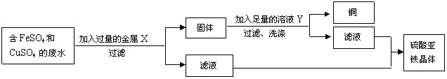 ⑶某校化学实验室废液桶中收集了溶解大量FeSO4和CuSO4(是重金属污染物之一)的废水,若直接排放到下水道既造成污染又造成浪费。某化学课外小组同学运用所学化学知识对废水进行处理,并回收硫酸亚铁晶体和铜,实验方案如下: