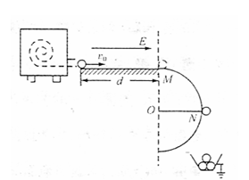 (16分)某塑料球成型机工作时,可以喷出速度v0=10m/s的塑料小球,已知喷出的每个小球的质量m=1.0×10-4kg,并且在时喷出时已带了q=-1.0×10-4C的电荷量。如图所示,小球从喷口飞出后,先滑过长d=1.5m的水平光滑的绝缘轨道,而后又过半径R=0.4m的圆弧形竖立的光滑绝缘轨道。今在水平轨道上加上水平向右的电场强度大小为E的匀强电场,小球将恰好从圆弧轨道的最高点M处水平飞出;若再在圆形轨道区域加上垂直纸面向里的匀强磁场后,小球将恰好从圆弧轨道上与圆心等高的N点脱离轨道,最后落入放在地面上接地良好的金属容器内,g=10m/s2,求: