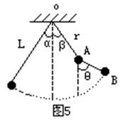 [例1]一质量为m的小球,与长为l的细绳组成一单摆。现将此单摆拉到与竖直线成α角的位置,由静止释放,在摆动途中,摆绳被一钉子A所阻,钉子与摆的悬挂点o相距r,两者连线与竖直线成β角。如图5所示。试求: