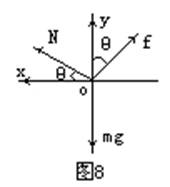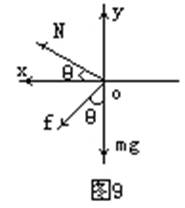 即当ω<ω0时,有下滑的趋势,摩擦力向上;当ω>ω0时,有上滑趋势,摩擦力向下。ω2=8rad/s>ω0,故f向下,受力如图9所示。牛顿运动定律方程