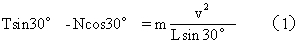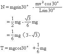 [例4](83年高考题)一个光滑的圆锥体固定在水平桌面上,其轴线沿竖直方向,母线与轴线之间的夹角为30°(图示10),一条长度为L的绳(质量不计)一端固定在圆锥体的顶点A处,另一端系着一质量为m的小物体(小物体可看作质点),物体以速度v绕着圆锥体的轴线作水平匀速圆周运动(物体和绳在附图中都没画出)。求