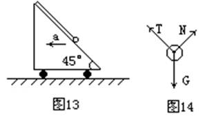[解析]当加速度较小时,小球是压在斜面上的,小球受重力G、支持力N和张力T三个力的作用,受力如图14所示。当加速度很大时,小球将飘离斜面,此时小球只受重力G和张力T'的作用,受力如图15所示。为准确判断是属于哪一种情况,必须以小球压在斜面上还是飘离斜面为界,求出其制约参量加速度的临界值a0。当a<a0时,小球压在斜面上,且有支持力存在。当a>a0时,小球飘离斜面,当然也就没有支持力存在了。因此解这类问题时,可以先求出临界加速度