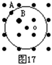 [例7]如图17所示,一质量为m的小球,带正电荷Q,固定在绝缘细绳oA的B点,oB = r,A端套在以o为圆心,R为半径的光滑圆环上。整个系统同处在光滑绝缘的水平面上,且平面所在的区域具有强度为B方向竖直向上的匀强磁场。当A、B绕o以匀角速ω在水平面上顺时针旋转时,试讨论AB和oB两段绳的张力大小和方向。
