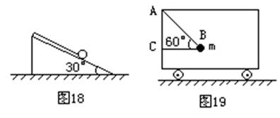 2.如图19所示,小车中有一夹角为60°的轻支架,其右端B处固定一个质量为1kg的重球。求: (1)当车以2m/s2的加速度向右匀加速前进时,水平杆BC受到的作用力。