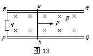1.0Ω的金属棒ab, 金属棒与导轨垂直, 如图13所示.在ab棒上施加水平拉力F使其以1Om/s的水平速度向右匀速运动.设金属导轨足够长.求: