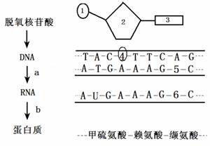 66.(9分)下图为真核生物细胞内有关遗传物质的结构与功能示意图,l~6代表物质,a、b代表生理过程,请据图回答: