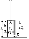 用如图所示的传统打气筒给容器打气,设打气筒的容积为V0,底部有一阀门K可自动开启并不漏气,活塞A上提时外界大气可从其四周进入打气筒,活塞下移时可把打气筒内气体推入B中。若B的容积为4V0,A、B内气体初始压强等于大气压P0,为使B中气体压强达到10P0,则需打气________次。某同学设想在筒内焊接一卡环C(体积不计)来控制B内的压强,为了控制B内气体的压强最大不超过10 P0,则卡环C到打气筒顶部的距离h与打气筒总长H的比值为__________(所有摩擦不计,打气时温度不变,连接部分体积不计)。