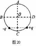 28.如图20所示,AC、BD为圆的两条互相垂直的直径,圆心为O。将等电量的正、负点电荷分别放在圆周上、它们的位置关于AC对称。则圆心O处的电场强度的方向为________,要使圆心O处的电场强度为零,可在圆周上再放置一个适当电量的正点电荷+Q,则该点电荷+Q应放在圆周上的_________点。