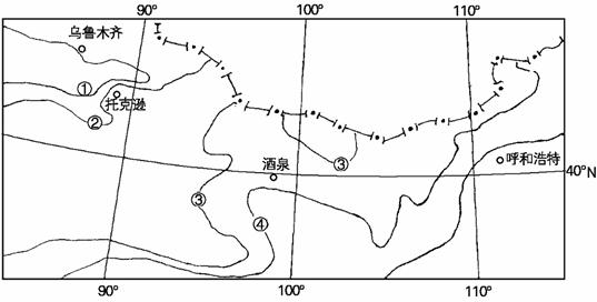 读“我国局部地区年等降水量线分布示意图”,回答33-34题。