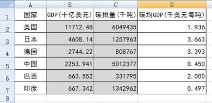 (1)利用公式对碳均GDP进行计算时,D2单元格中输入的内容是 。