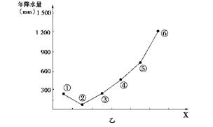 某研究人员依据我国多年平均气候资料,按一定方向分别选取了A-F和①-⑥共12个地区,分类绘成甲、乙两图,读图完成10-11题: