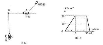 13.(12分)2009年11月26日,我国海军171海口号、169武汉号导弹驱逐舰和微山湖号补给舰为履行国际义务,奉命赴亚丁湾索马里海域,开始对过往船只执行护航任务。某日清晨,海面上有薄雾,一艘某国的货轮正在匀速行驶,到达A处时,船长突然发现后侧面不远处,有海盗的快艇正在向他们靠近,并预计还有40min就会追上货船,于是立即向在C处海域执行任务的我国某驱逐舰发出求援信号,我官兵立即推算出40min后的货船位置应在D处,马上调好航向,沿CD直线方向从静止出发,恰好在40min内到达D处,如图12所示,驱逐舰运动的速度、时间图如图13所示,求: