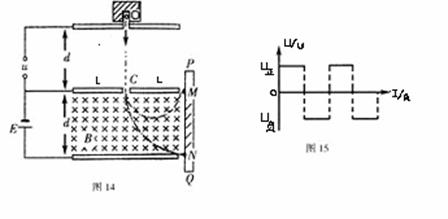14.(16分)利用电场和磁场的共同作用可以控制带电粒子的运动轨迹和运动形式。在某个探究实验室中,设计了如图14所示的装置,上中下三块长度均为2L的金属电极板平行等距正对放置,已知L=5㎝,相邻两板间相距均为d=10cm,上面两金属板正中有小孔,紧贴上板小孔有一个带电粒子发生器,可从小孔O处不断输出带电粒子(初速度较小可忽略不计),粒子的比荷为 q/m=10-2c/kg 。在上面两板间加周期性变化的方波电压(周期很大,远大于粒子运动时间),如图15所示,在下面两板间接入直流电源,电动势一定,同时该区域有垂直向里的匀强磁场,磁感应强度为B=1.6×10-3T,整个装置处于真空中。若带电粒子离开O点后,沿直线向下穿过中板中间的小孔C后恰好能在该区做匀速圆周运动,下面两板的右端紧靠着竖直的接收屏PQ,由于上两板间方波电压的作用,带电粒子恰好可以控制在经过两极板边缘的两条圆弧之间,最后打在紧靠两板末端边缘上的屏上的M、N两点及其之间,重力加速度为g=10m/s2
