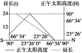 读“沿45°E经线各地某时刻正午太阳高度和昼长分布图”,回答第15题。