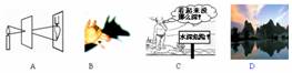 解析:A是光的折射现象,B也是光的折射现象,C是光的直线传播形成的,D是平面镜成像,是由光的反射形成的。![]()