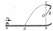 5、水平光滑直轨道ab与半径为R的竖直半圆形光滑轨道bc相切,一小球以初速度v0沿直线轨道向右运动,如图所示,小球进入圆形轨道后刚好能通过c点,然后小球做平抛运动落在直轨道上的d点,则: