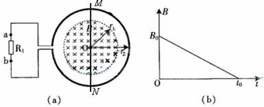 12、(19分)如图(a)所示,半径为r1的圆形区域内有均匀磁场,磁感应强度为B0,磁场方向垂直纸面向里,半径为r2的阻值为R的金属圆环与磁场同心放置,圆环与阻值也为R的电阻R1连结成闭合回路,一金属棒MN与金属环接触良好,棒与导线的电阻不计,