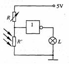 右图为包含某逻辑电路的一个简单电路图,L为小灯泡.光照射电阻R' 时,其阻值将变得远小于R。下列说法中正确的是