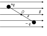 如图所示,在光滑水平面上,一绝缘细杆长为l,两端各固定着一个带电小球,处于水平方向、场强为E的匀强电场中,两小球带电量分别为+q和-q,轻杆可绕中点O自由转动。在轻杆与电场线夹角为θ时,忽略两电荷间的相互作用,两电荷受到的电场力对O点的力矩大小为