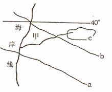 27.右图中的40°线为纬线,a、b、c为等温线,甲为河流,并且甲地常年受西风的控制。读图回答下列问题。(10分)