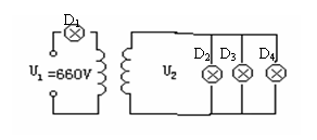 如图所示,一个交流高压电源的电压恒为660v,接在变压器上给负载供电。已知变压器副线圈的匝数为n2=110匝,灯泡D1、D2、D3、D4是完全相同的灯泡,其上标有“220v,220W”,1、若起初电路中没有灯泡D1时,灯泡D2、D3、D4均正常发光,则变压器的原副线圈的匝数比n1:n2为多少?原线圈中磁通量变化率的最大值为多少?2、若在原线圈上接上灯泡D1时,则灯泡D2的实际功率为多少?(不考虑灯泡电阻随温度的变化)