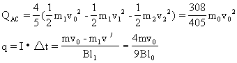 (16分)在如图所示的水平导轨上(摩擦、电阻忽略不计),有竖直向下的匀强磁场,磁感强度B,导轨左端的间距为L1=4l0,右端间距为l2=l0。今在导轨上放置ACDE两根导体棒,质量分别为m1=2m0,m2=m0,电阻R1=4R0,R2=R0。若AC棒以初速度V0向右运动,求AC棒运动的过程中产生的总焦耳热QAC,以及通过它们的总电量q。