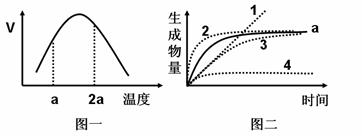 22. 下图一表示温度对酶促反应速率的影响示意图,图二的实线表示在温度为a的情况下生成物量与时间的关系图。则可用来表示当温度为2a时生成物量与时间关系的是: