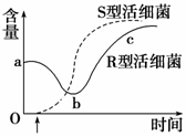 在肺炎双球菌转化实验中,将加热杀死的S型细菌与R型活细菌混合后,注射到小鼠体内,小鼠死亡,在小鼠体内S型活细菌和R型活细菌含量变化情况如图所示。下列叙述错误的是: