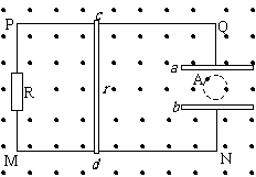 。一根电阻为r的细导体棒cd,导体棒与导轨接触良好,不计导轨和导线的电阻。若导体棒cd以速率v向右匀速运动时,在平行金属板a、b之间有一个带电液滴恰好在竖直平面内做匀速圆周运动。求: